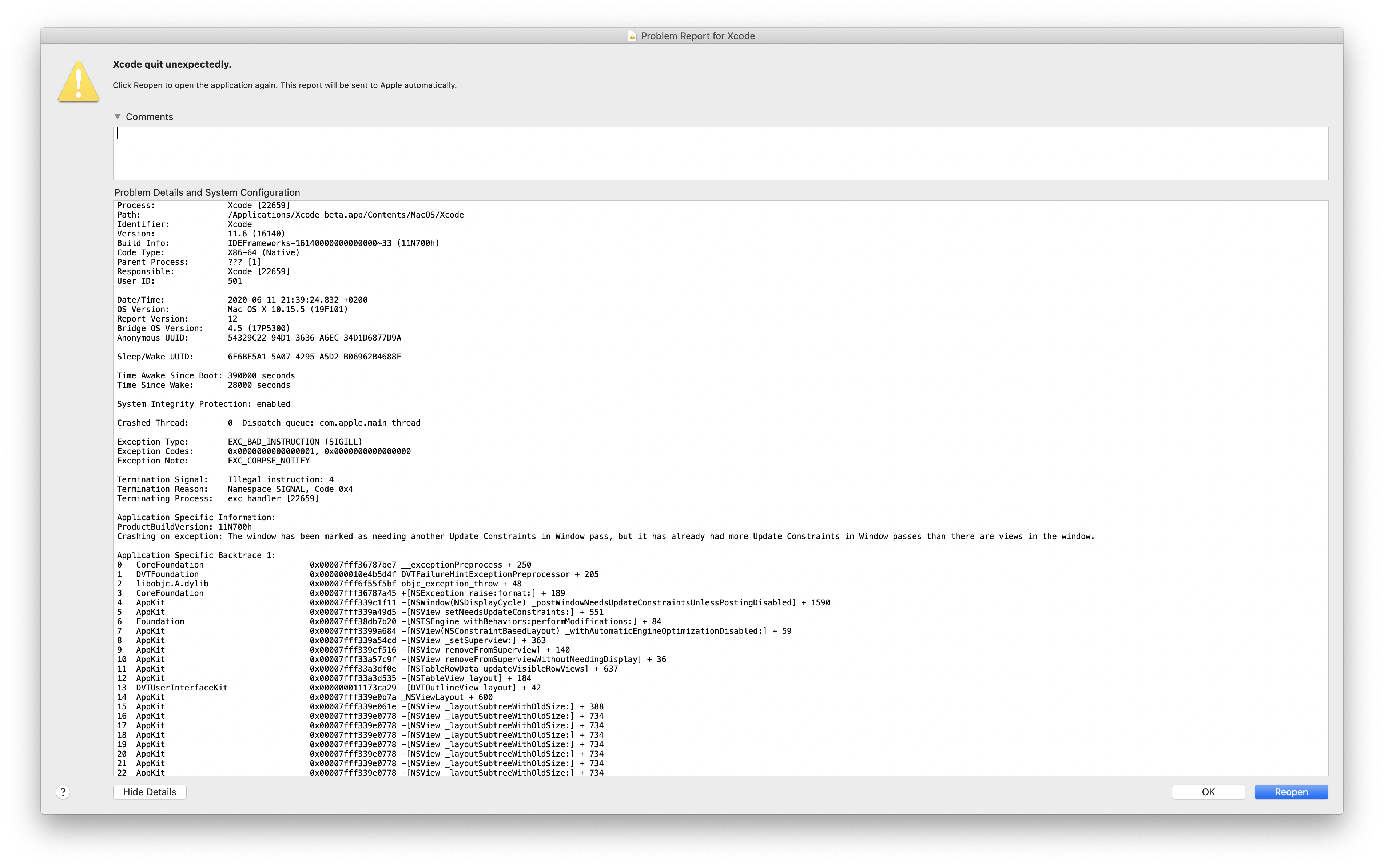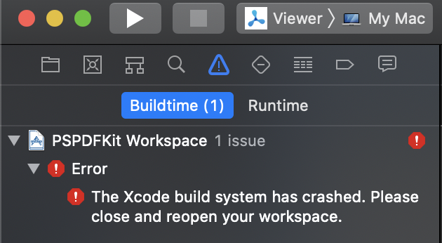 Build system crashes are especially fun because Xcode doesn’t crash, but you still have to quit and restart it manually. One could make the argument that it would be more convenient if Xcode would simply crash as well.