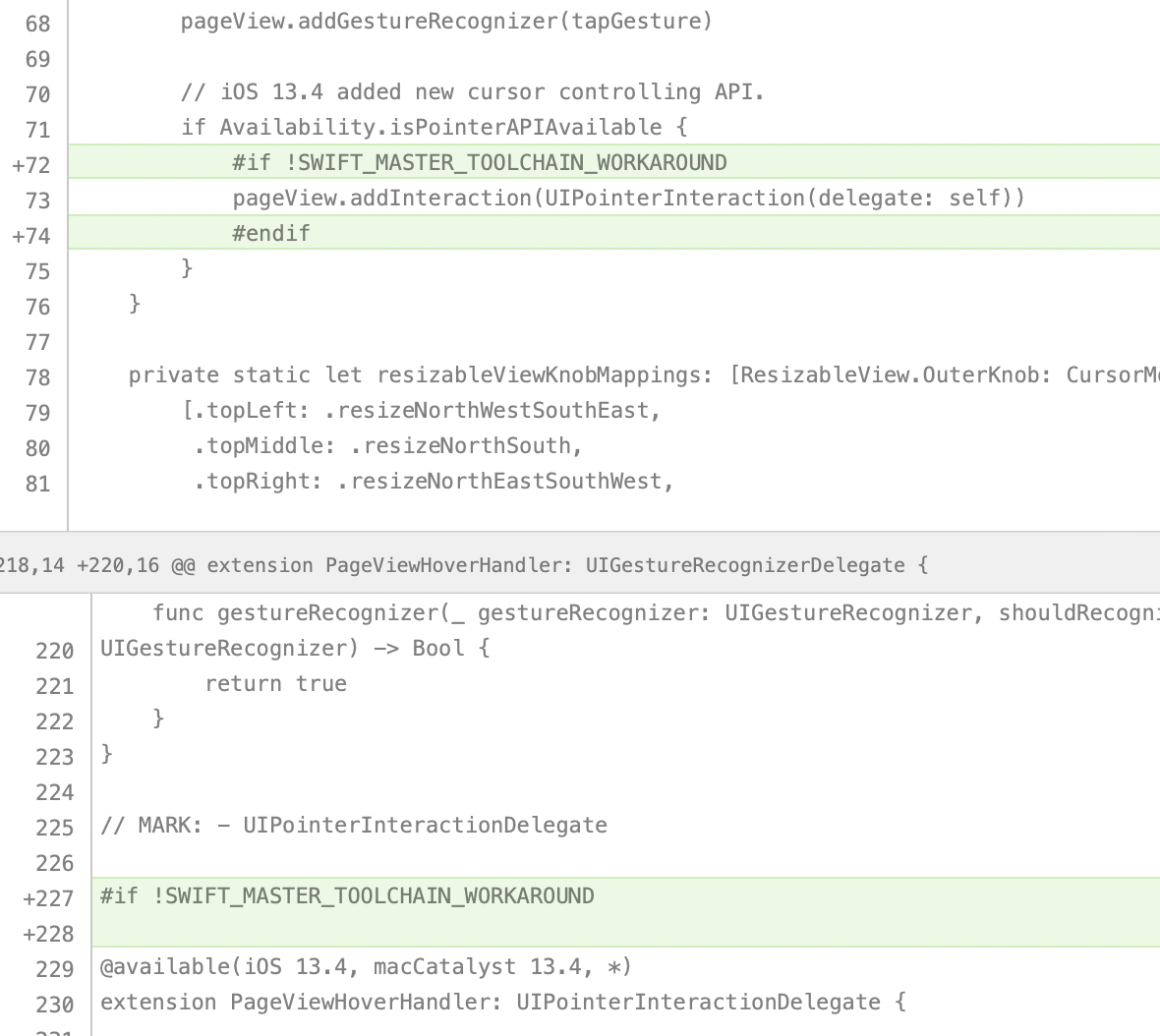 Apple uses API notes to make the mapping from Objective-C to Swift easier. They are currently to a degree tightly coupled with Clang itself, and as the UIPointerInteraction API is very new, these notes haven’t been upstreamed yet — so we get a different, non-optimized API in Swift when compiling with trunk.