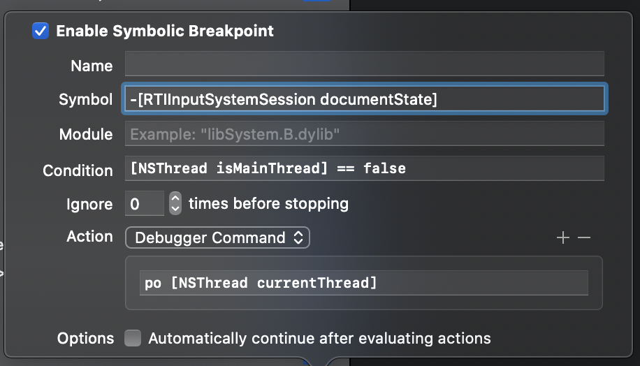 I’m using a conditional breakpoint that stops if non-main-thread access is detected. It also prints out the thread automatically. Since we’re in AppKit, methods are usually called on the main thread (remove the condition to verify). However, sometimes this is called from an XPC thread: