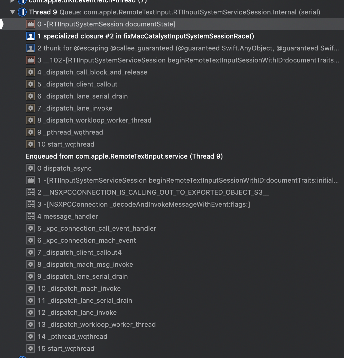 Taking a closer look at RemoteTextInput.framework, we can see it uses XPC under the hood. XPC uses background threads to communicate: